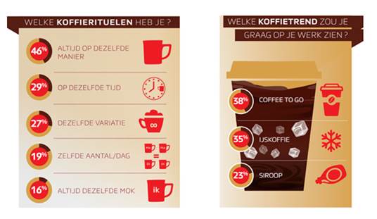 De Koffiemonitor gaat dit jaar over de koffierituelen van werkende Nederlanders. Van hen geeft 79 procent aan vaste gebruiken te hebben bij het drinken van koffie op de werkvloer. Wel staan werknemers ervoor open om zo nu en dan af te wijken van hun koffieritueel. Ondanks dat bijna drie op de tien dagelijks dezelfde koffievariatie kiezen, zegt een kwart daar best een smaakje aan toe te willen voegen met speciale siropen zoals vanille of karamel. Nog eens één op de drie zou zelfs graag een ijskoffie willen drinken op de werkvloer. Hiermee lijkt een trend te zijn gezet waarbij koffiegewoontes uit de horeca ook hun intrede doen op de werkvloer.