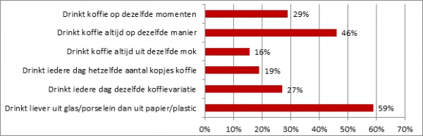 Bijna drie op de tien koffiedrinkers drinkt de hele dag door dezelfde koffievariant. Een kleine dertig procent drinkt dagelijks op vaste tijden koffie. Ook drinkt bijna twintig procent van de Nederlandse werknemers een vast aantal kopjes koffie. Bijna zes op de tien geeft aan de koffie liever uit servies van glas of porselein te drinken dan uit een papieren of plastic beker.